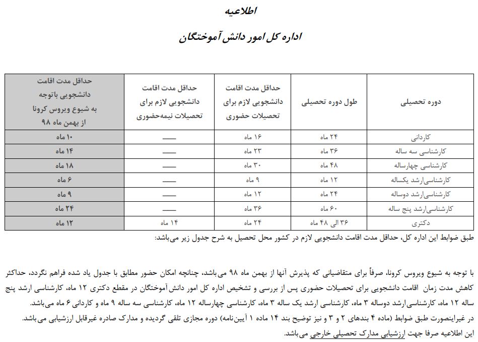 *دانشجویانی که نمیتوانند از مزایای جدید حداقل مدت اقامت دانشجویی که در بالا به آن اشاره شده است استفاده نمایند با توجه به تسهیل شرایط انتقال به داخل کشور، از طریق اداره کل دانشجویان داخل وزارت علوم اقدام نمایند.