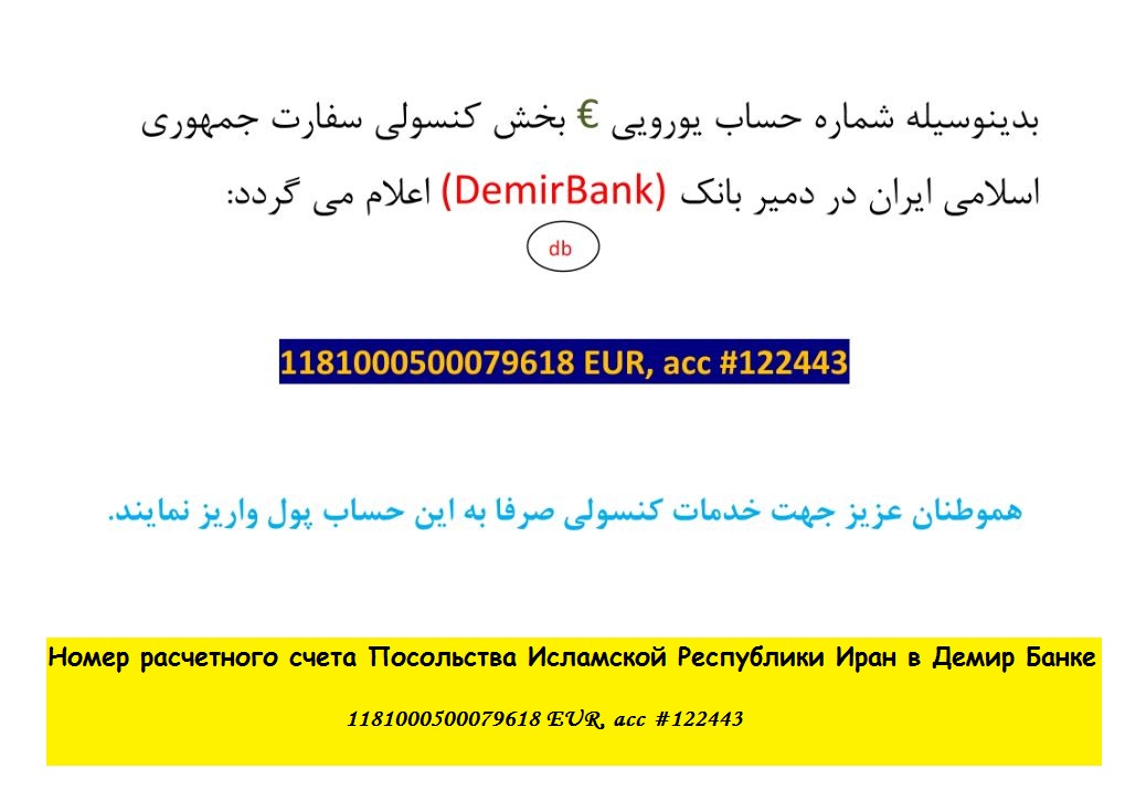 به نام سفارت جمهوری اسلامی ایران در بیشکک نزد دمیر بانک (موقع واریز باید گذرنامه همراه داشته باشید)