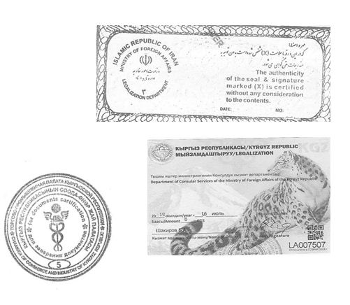 *اسنادی که در ایران به تایید وزارت امور خارجه در تهران و یا دفاتر استانی آن از جمله مشهد رسیده باشند جهت ارائه به مقامات قرقیزستان باید ابتدا به تایید بخش کنسولی سفارت جمهوری اسلامی ایران در بیشکک برسد و سپس بخش تایید اسناد وزارت امور خارجه قرقیزستان آن را تایید کند.