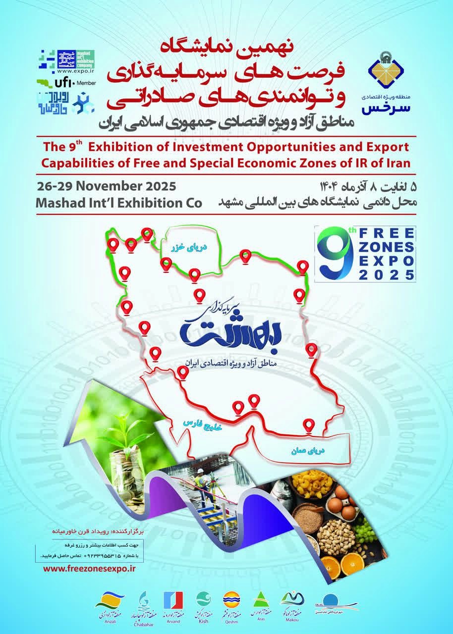 نهمین نمایشگاه فرصت های سرمایه گذاری و توانمندی‌های صادراتی مناطق آزاد و ویژه اقتصادی جمهوری اسلامی ایران مورخ 5 لغایت 8 آذرماه 1404 در نمایشگاه بین المللی مشهد برگزار خواهد شد. علاقمندان جهت اطلاعات بیشتر و استفاده از تسهیلات در نظر گرفته شده به سایت نمایشگاه به نشانی www.freezonesexpo.com   مراجعه و یا با شماره 989233955315+ تماس حاصل فرمایند.